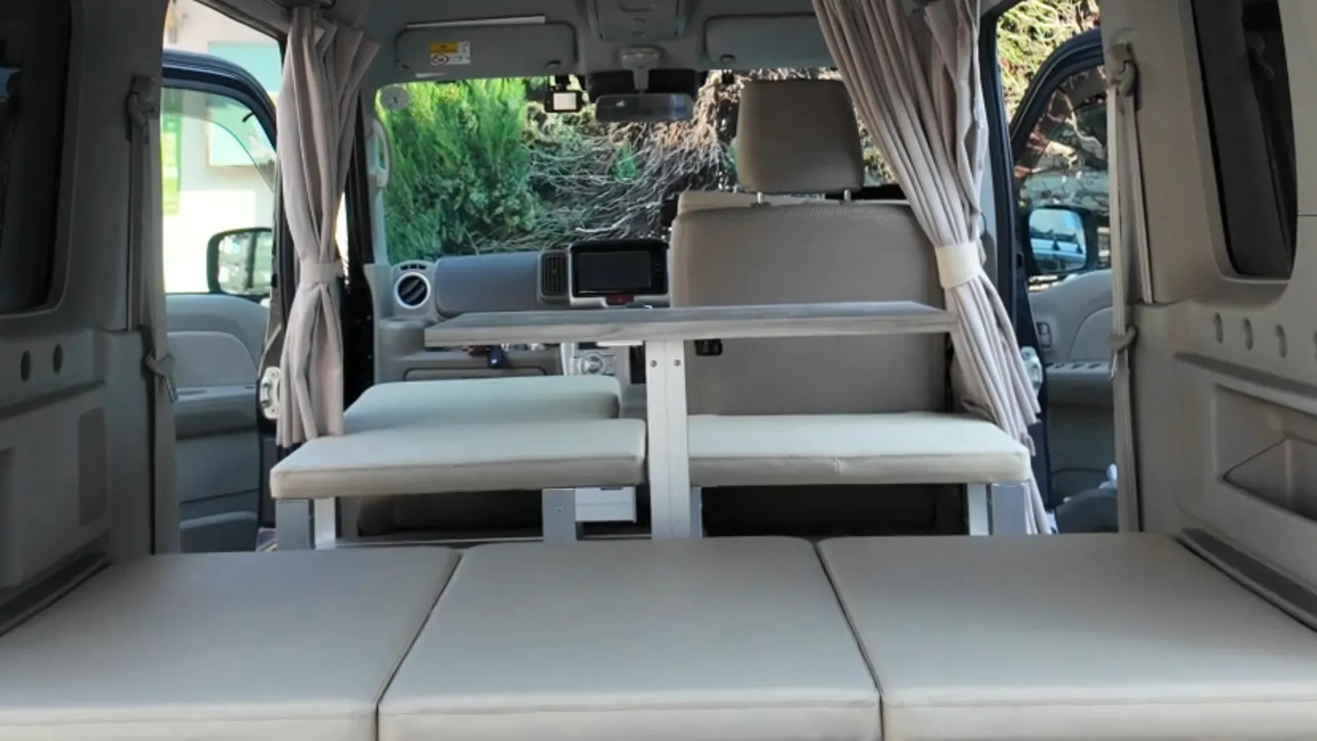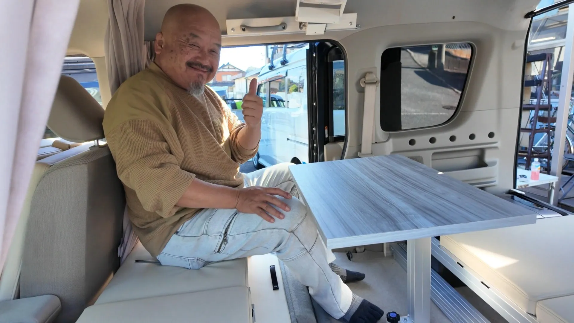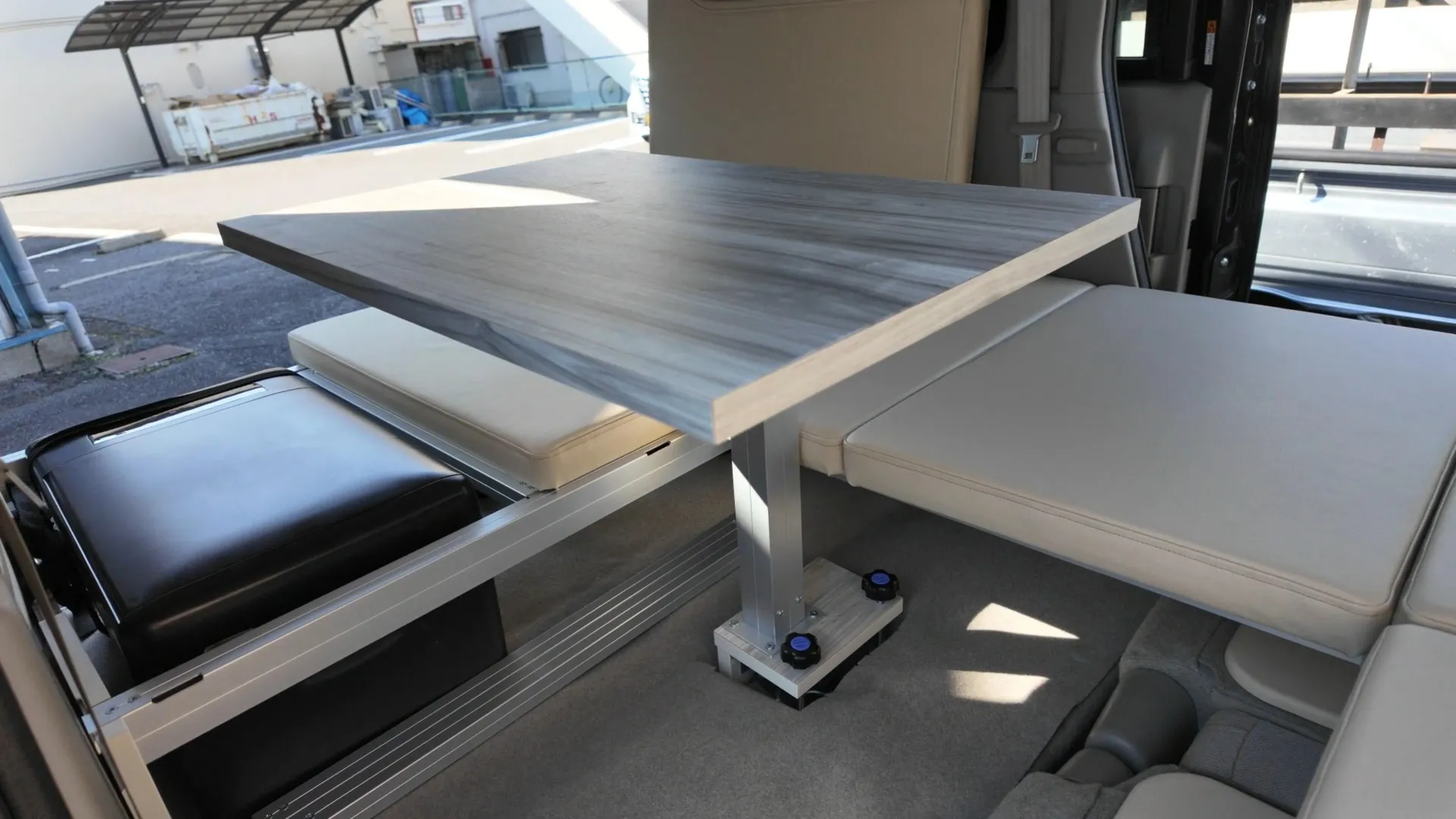 センター部分に設置可能な専用テーブルにより、車内が瞬時にリビングルームへと変わります。外の景色を眺めながらの食事や、ワーケーションでのPC作業にも最適な高さに設計。テーブルを囲んで対面で座ることもでき、雨天時の休憩場所としても重宝します。取り外しも簡単で、使用しない時はベッド下にスマートに格納できる機能美を備えています。