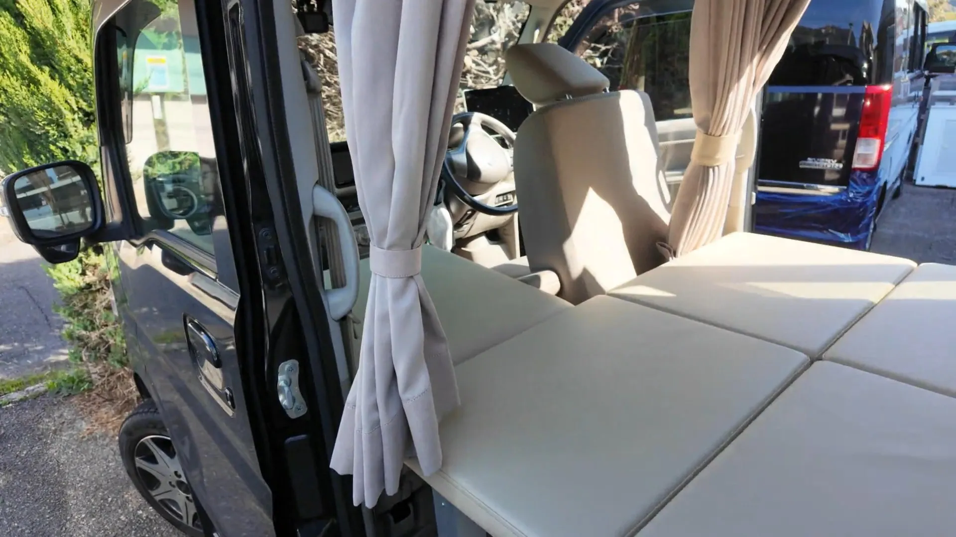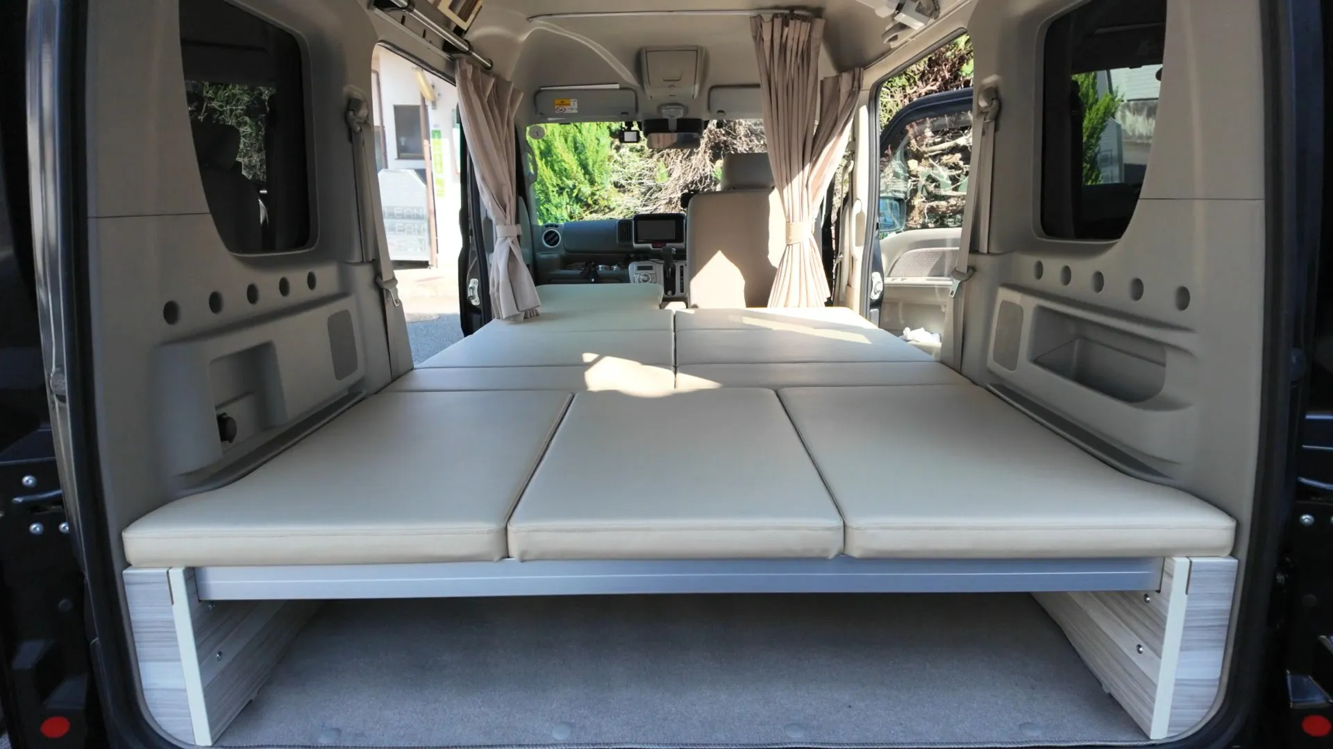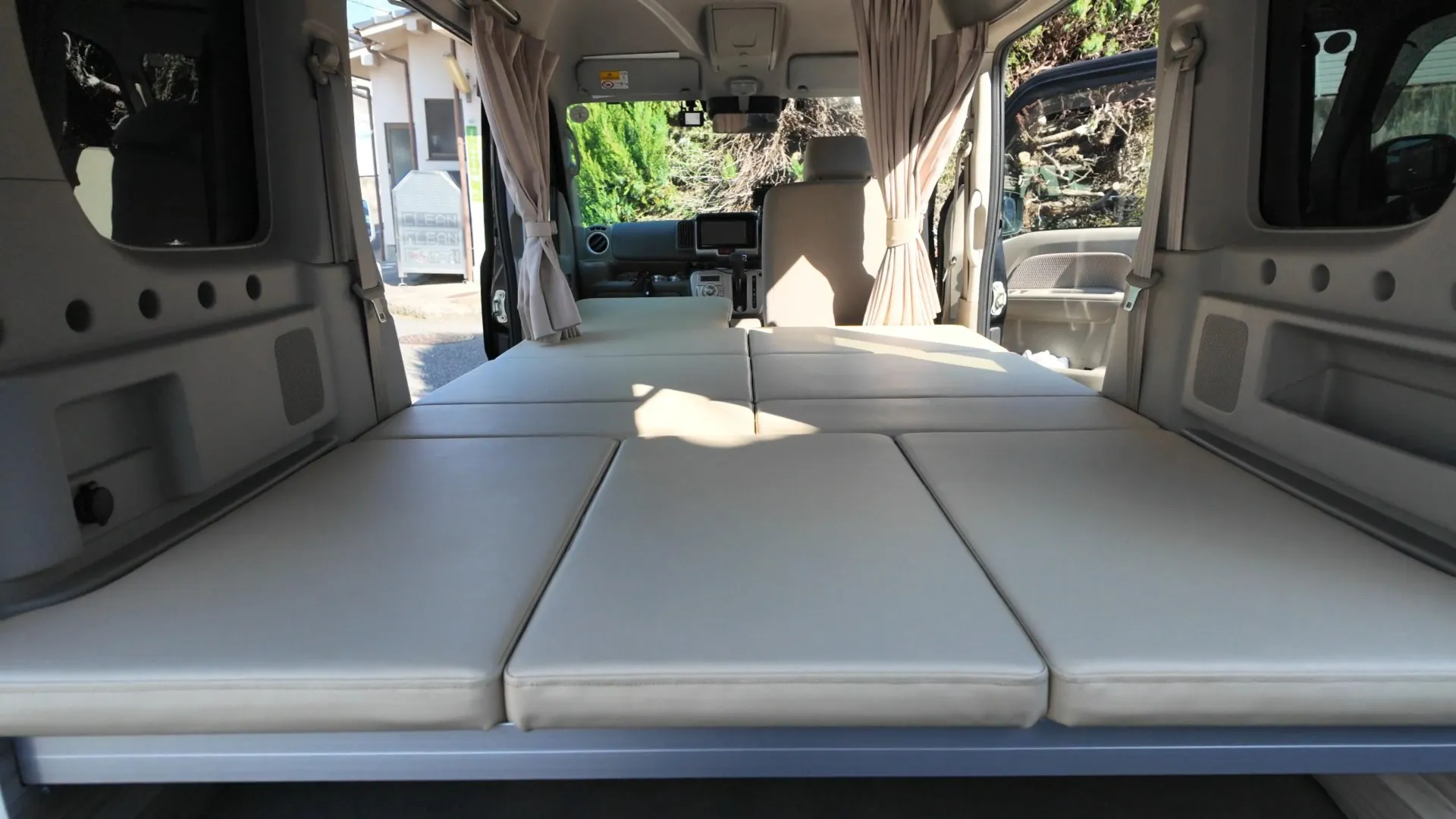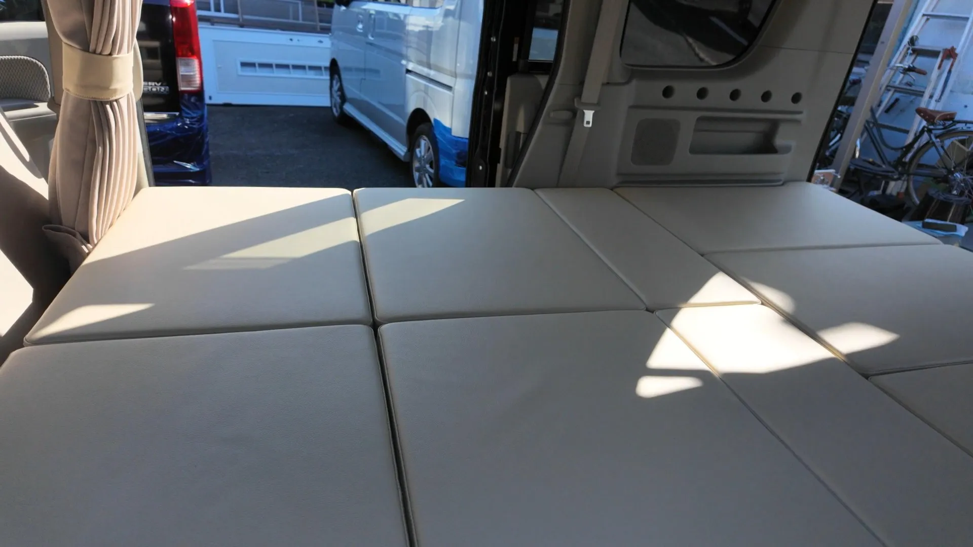 最大の特徴は、軽自動車の限られた空間をフル活用したフラットな寝床です。高密度のクッション素材を採用し、車中泊特有の段差によるストレスを解消。長距離ドライブ後の休息も、まるで自宅の布団のような寝心地で快適に過ごせます。設営はマットを並べるだけのシンプル設計。大人2人が並んで横になれる広々としたスペースを確保しています。
